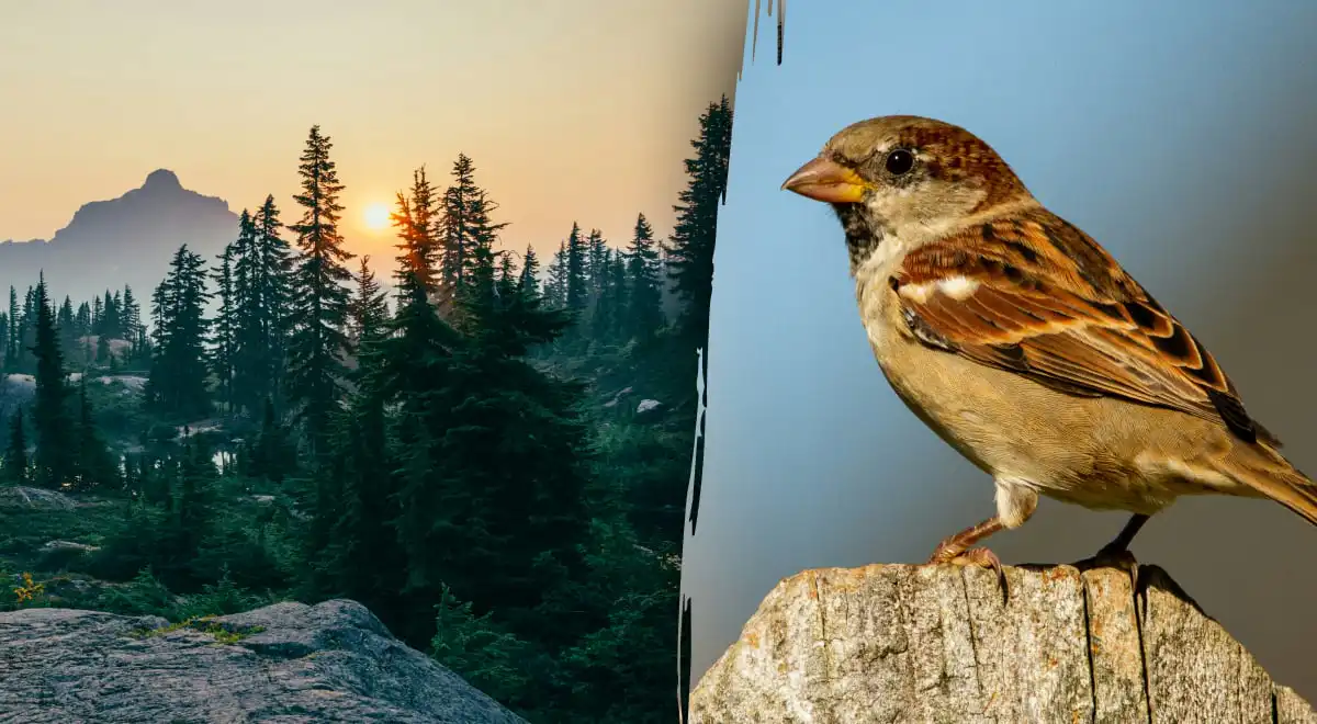 Um pardal está perfeitamente camuflado numa paisagem montanhosa. A sua plumagem castanha e cinzenta confunde-se com os troncos das árvores e as rochas. Para o encontrar em apenas 7 segundos, é preciso ignorar o panorama geral e focar-se nos pequenos detalhes que parecem “fora do lugar”.