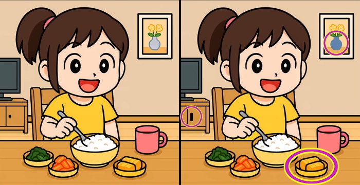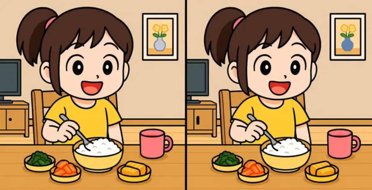 Duas imagens aparentemente idênticas de uma jovem à mesa escondem três pequenas diferenças. O desafio é encontrá-las em menos de 49 segundos, testando a sua atenção e rapidez visual. A solução está na observação de detalhes como padrões, cores e formas.