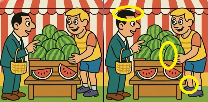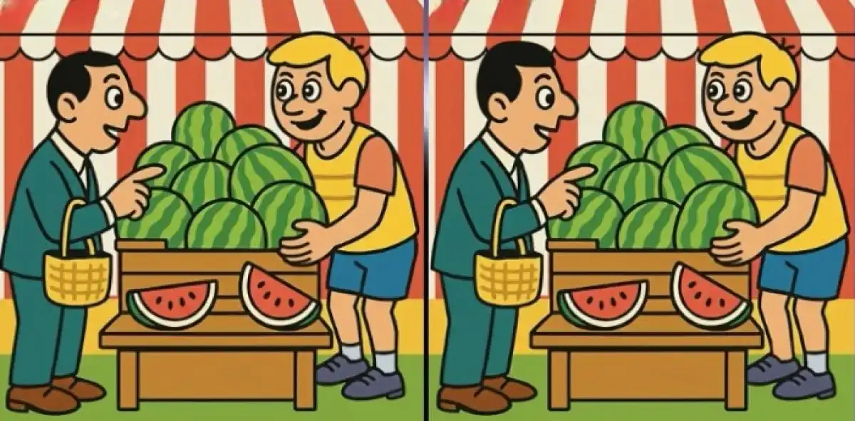 Este é um clássico teste de atenção visual: duas imagens aparentemente idênticas de um homem a comprar uma melancia escondem três pequenas diferenças. O desafio é encontrá-las em apenas 27 segundos, treinando o seu foco e percepção de detalhes. A solução está em observar não o todo, mas as partes.