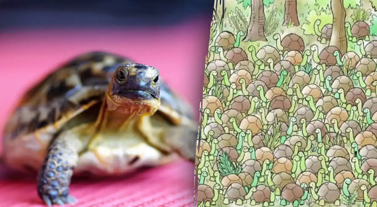 Esta ilusão de ótica desafia a sua atenção ao esconder uma cobra entre uma multidão de tartarugas sorridentes. A solução está em focar-se nos detalhes que quebram o padrão, especialmente na área esquerda da imagem.