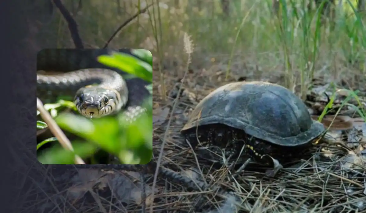 A cobra estava esticada no canto inferior direito da imagem, ligeiramente acima e à direita da tartaruga, misturando-se com a relva seca e os gravetos.