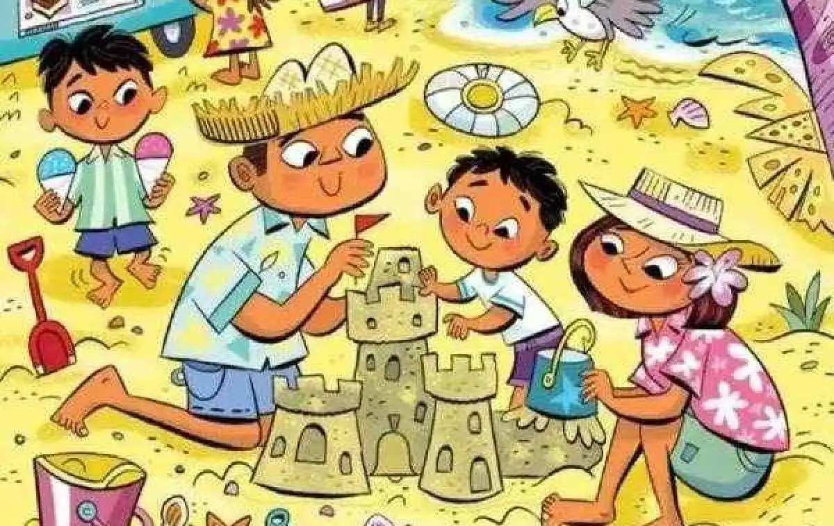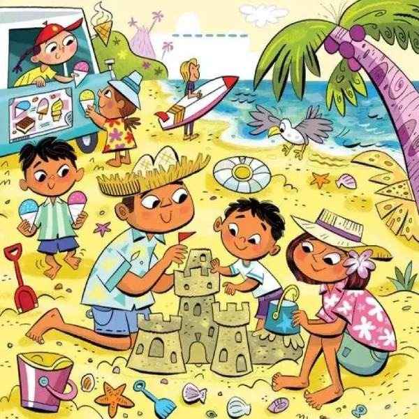 A imagem apresenta um cenário comum e descontraído: uma família aproveita um dia de sol. Os pais estão ao lado de um castelo de areia, enquanto duas crianças correm alegremente com seus gelados. Ao fundo, uma surfista aguarda a próxima onda, e elementos como uma gaivota, uma palmeira e o mar completam a paisagem. Tudo parece normal, mas há um intruso neste cenário relaxante. O seu objetivo é encontrá-lo antes que o tempo acabe. A primeira impressão é enganadora – o íman está lá, perfeitamente integrado. Consegue vê-lo?