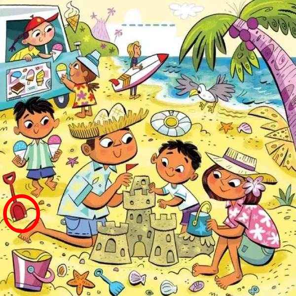 Esta imagem de uma família na praia esconde um objeto inesperado: um íman. A solução está na capacidade de olhar além do óbvio e perceber como um elemento comum pode ser camuflado no cenário. A resposta não está no chão, mas sim em algo que todos veem.